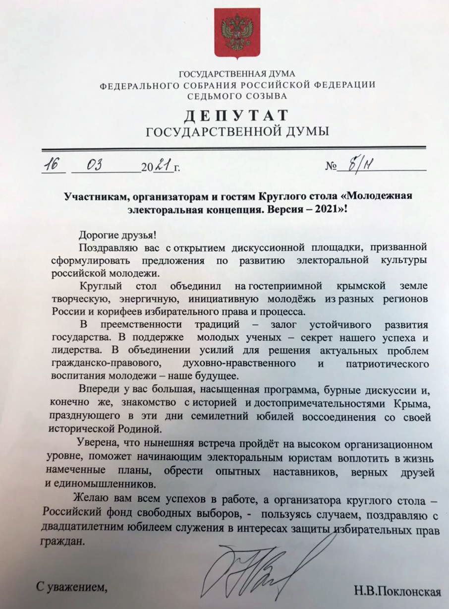 Депутат Государственной Думы Федерального Собрания Российской Федерации Наталья Поклонская направила приветственное обращение участникам, организаторам и гостям Круглого стола «Молодежная электоральная концепция. Версия – 2021», который состоялся 16-18 марта 2021 года в Крыму. Организатором мероприятия выступил Российский фонд свободных выборов.