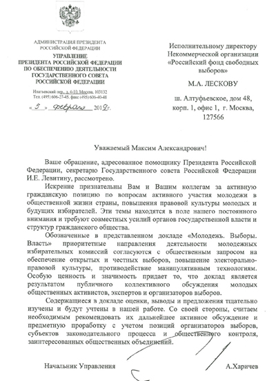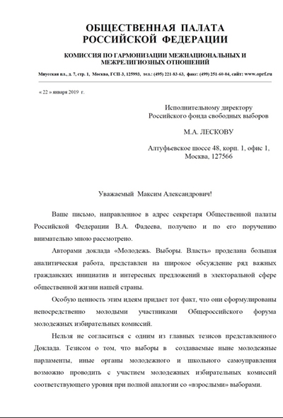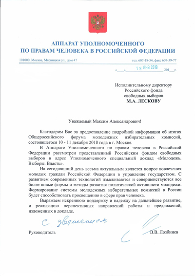 2. Уполномоченный по правам человека в Российской Федерации дал высокую оценку специальному докладу "Молодежь. Выборы. Власть." Выражена поддержка и надежда на развитие предложений, изложенных в Докладе.