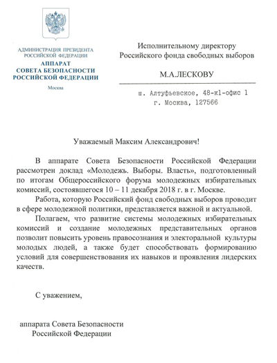 4. В отзыве Аппарата Совета Безопасности Российской Федерации указывается на то, что "развитие системы молодежных избирательных комиссий и создание молодежных представительных органов позволит повысить уровень правосознания и электоральной культуры молодых людей, а также будет способствовать формированию условий для совершенствования их навыков и проявления лидерских качеств. Работа, которую проводит Российский фонд свободных выборов в сфере молодежной политики, представляется важной и актуальной".