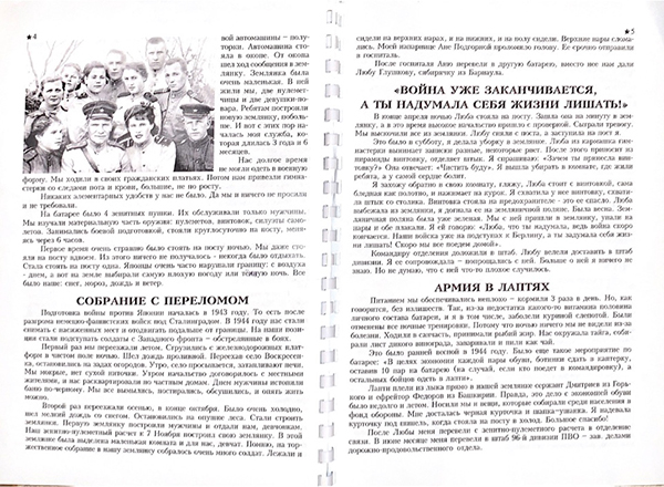 Подготовка к войне против Японии началась в 1943 году, после разгрома немецко-фашистских войск под Сталинградом. На наши позиции стали прибывать солдаты с Западного фронта, обстрелянные в боях. Помню собрание в землянке к 7 ноября. Набилось к нам много солдат, лежали и сидели на верхних, нижних нарах, на полу. Верхние нары под тяжестью провалились, и моей напарнице проломило голову. Прямо с собрания ее отправили в госпиталь. На смену ей мне дали Любу Глушкову, сибирячку из Барнаула.