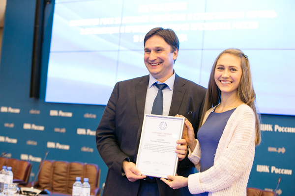 По окончании наших выступлений Николай Иванович предложил перейти к самой приятной части – вручению Благодарственных писем. Я получила благодарственное письмо Центральной избирательной комиссии за активное содействие и существенную помощь в организации и проведении выборов в Российской Федерации. После вручения ребятам благодарственных документов, я от лица Союза Молодежных избирательных комиссий вручила Ягодиной Ольге Львовне и Лескову Максиму Александровичу благодарности Союза МИК России за всестороннюю поддержку и неоценимый вклад при создании и текущей деятельности Союза Молодежных избирательных комиссий России. На этом церемония награждения подошла к концу, и мы приступили к обсуждению рабочих моментов.
