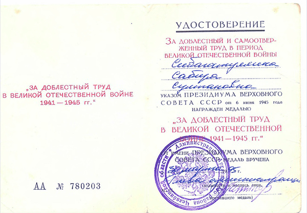 Тяжело было на войне, но не легче приходилось оставшимся в тылу. Вместе с другими женщинами и подростками трудилась и моя бабушка Сабира Султановна. Она работала, как и все колхозницы, – от зари до зари. Она уставала от непосильного труда, практически все выращенное отправлялось на фронт. Тем не менее, в то время никто не жаловался на судьбу, так как все понимали и поддерживали друг друга такими фразами: «Чем больше и лучше поможет тыл, тем быстрее закончится война и будет разбит лютый враг».