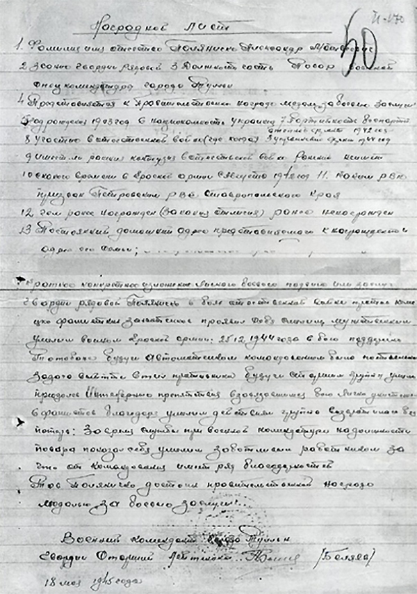 В одном из сохранившихся наградных листов от 18 мая 1945 года военный комендант города Тульн (Тульн-ан-дер-Донау – окружной центр в Австрии) Гвардии старший лейтенант Беляев коротко описал моего прадеда: «гвардии рядовой Поляничко в боях Отечественной войны против немецко-фашистских захватчиков проявил себя смелым, мужественным, умелым воином Красной армии. 25 декабря 1944 года в бою под деревней То…, будучи автоматчиком, командованию была поставлена задача выйти в тыл противника. Являясь старшим группы, он умело преодолел все препятствия в завязавшемся бою, лично уничтожил 6 фашистов. И благодаря умелым действиям, группа возвратилась без потерь. Товарищ Поляничко достоин правительственной награды медаль «За боевые заслуги».