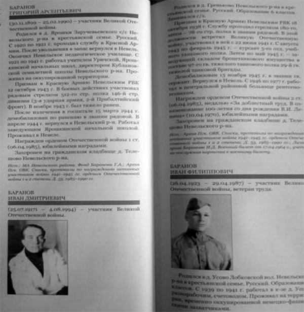 Тогда я обратилась к 4 тому книги «Солдаты Победы», из которой узнала, что Баранов Иван Дмитриевич награжден орденом Отечественной войны II степени, медалью «За доблестный труд. В ознаменование 100-летия со дня рождения В.И. Ленина» - юбилейными наградами. К сожалению, награды не сохранились в связи с переездами.