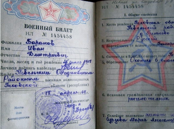 Семейные фотографии… В них прослеживается летопись семьи, летопись страны. В нашем семейном альбоме много ярких цветных фотографий. Но есть среди них и особенные. Недавно я нашла маленькую черно-белую фотографию, пожелтевшую и потертую от времени. С нее на меня смотрел мужчина средних лет. На нем белый халат, а под ним военная гимнастерка. Когда я спросила, почему на нем военная форма, бабушка достала военный билет, который бережно хранится среди документов, из которого узнала о своем двоюродном прадедушке – Баранове Иване Дмитриевиче (25.07.1917-04.08.1994).