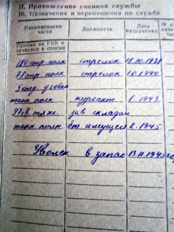 Следующая запись датирована октябрем 1940 года. Ивана Дмитриевича направили в 78-й стрелковый полк в том же звании и должности стрелок. Именно здесь он узнал о начале Великой Отечественной войны. В этом полку он прослужил до февраля 1943 года. Из воспоминаний его жены я узнала, что у Ивана всегда было стремление учиться. И когда ему предложили учиться танковому делу, он, не раздумывая, согласился. Поэтому с августа 1943 года по февраль 1945 года он являлся курсантом 5 отделения учебно-танкового полка. Здесь он получил специальность «Специалист по ремонту и хранению бронетанковой техники».