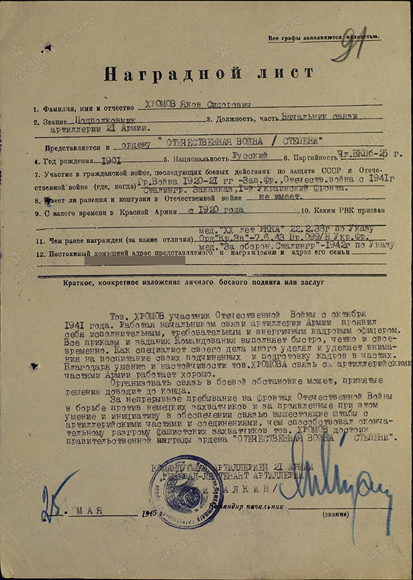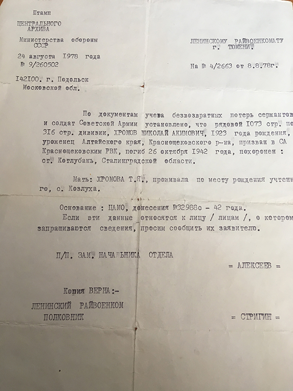 О судьбе Николая стало известно 22 августа 1978 года. Петр, самый младший ребенок в семье, работал на тот момент в военкомате в Тюмени и сделал запрос в Центральный архив Министерства обороны СССР, откуда получил ответ, что рядовой Хромов Николай Акимович был убит 26 октября 1942 года и захоронен в станице Котлубань Сталинградской области.