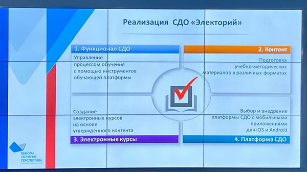 В рамках научного мероприятия Российский центр обучения избирательным технологиям при ЦИК России презентовал систему дистанционного обучения «Электорий». Аудитории были представлены многофункциональная адаптивная структура обучающего проекта, предлагаемый контент и принципы работы с системой. Полномасштабное внедрение и использование «Электория» запланировано на 2021 год.